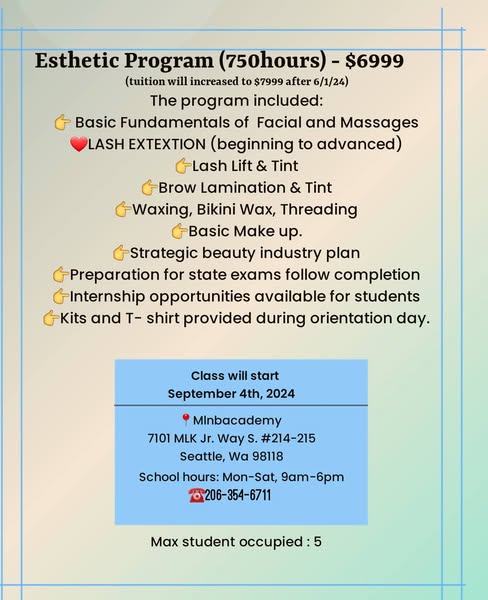 搜索关键词 beauty school Seattle, esthetics program, nail technician training, lash extension course, PMU training, beauty career, vocational education, Seattle beauty academy, MLNB academy, beauty certification优势 Comprehensive training programs,Payment plans available,Kits and Certification included,Multilingual instruction (Vietnamese, Spanish, English)