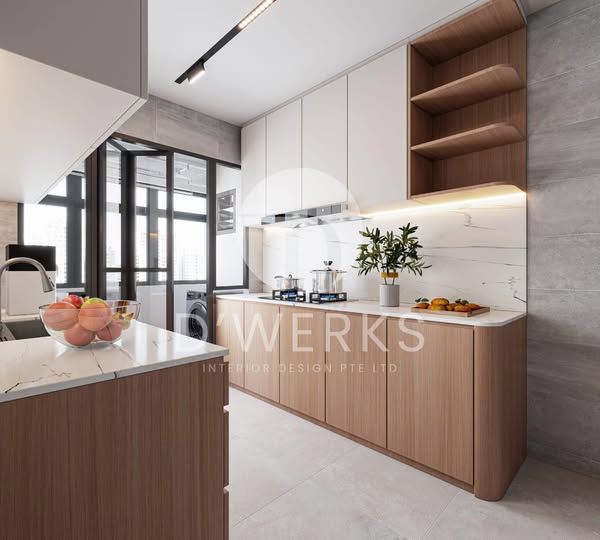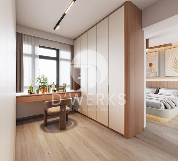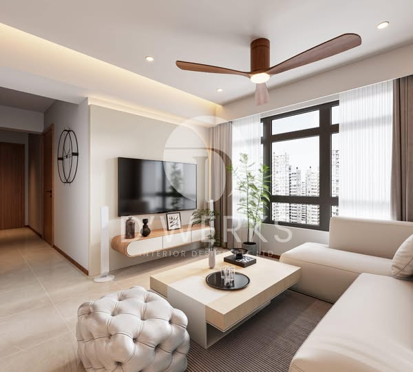 搜索关键词 modern Scandinavian interior, 奶油风 interior design, Singapore home renovation, HDB interior design, warm home decor, natural home atmosphere, space saving solutions, comfortable living environment, interior design proposal, dwerks interior design优势 Warm and harmonious color scheme,Natural atmosphere with wooden elements,Open concept design for enhanced fluency,Multifunctional desk area for practicality,Large-capacity storage cabinets integrated with the wall