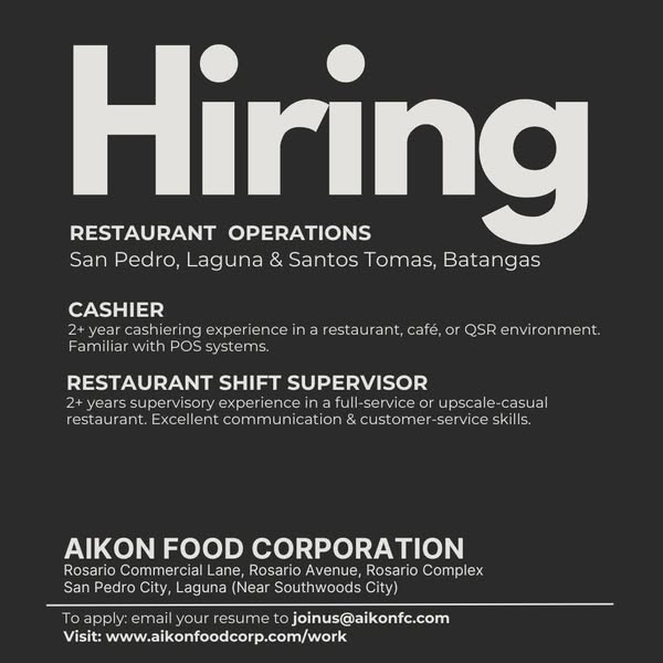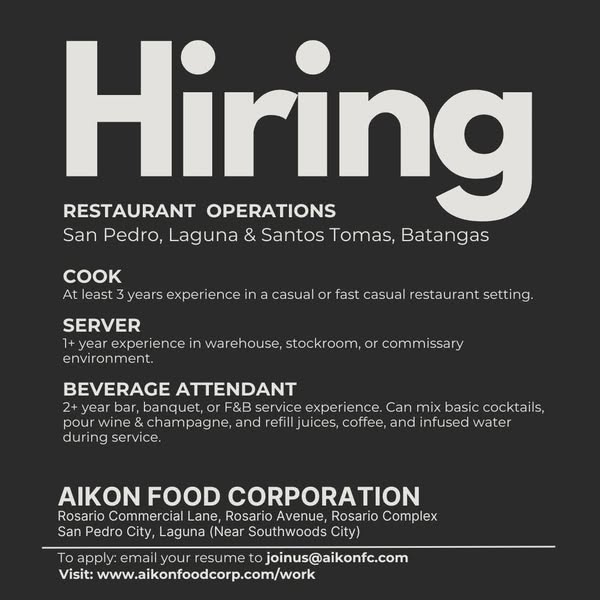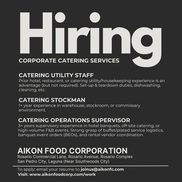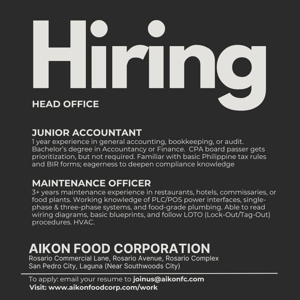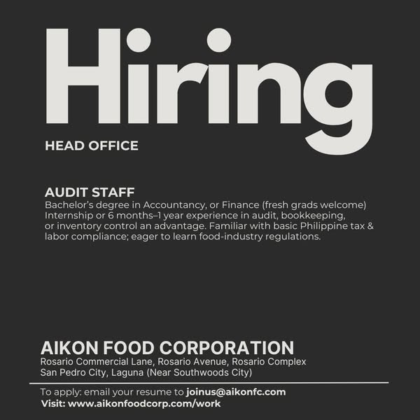 搜索关键词 Aikon Food Corp Hiring, Food Industry Jobs Philippines, Job Opportunities Laguna, Career in Food Company, Hiring Now San Pedro, Join Our Team Aikon, Food Corporation Careers, Aikon Recruitment, Philippines Food Industry, Food Production Jobs优势 Opportunity to join a dynamic food company.,Career building potential.,Clear application process (email resume).