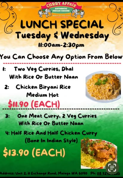 搜索关键词 Curry Affair, Lunch Specials, Malaga Restaurant, Australian Food, Indian Cuisine, Affordable Lunch, Western Australia Food, Chicken Curry, Dosai, Khati rolles优势 Affordable price ($11.90),Variety of options (meat, veg, chicken),Convenient hours (Tuesday to Sunday, 11:00am - 2:30pm)