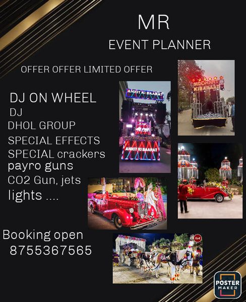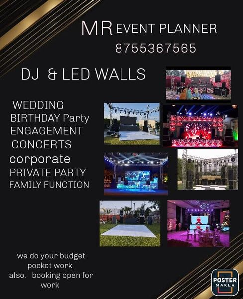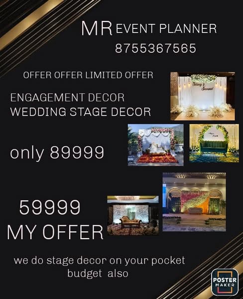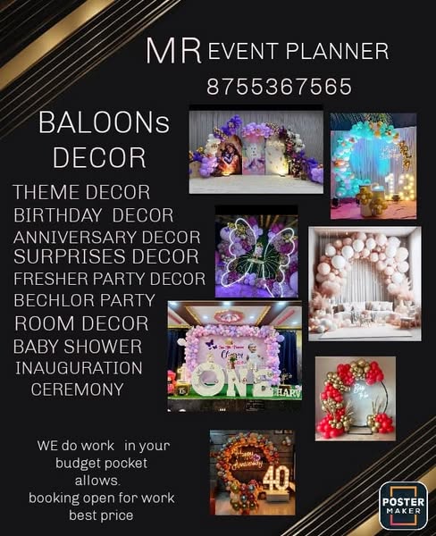 搜索关键词 wedding decorations, birthday party, event planner, catering services, party decorations, haldi mehandi, dj with walls, flower decor, college party, home decor优势 Wide range of event types covered (wedding, birthday, etc.),Comprehensive services (decoration, catering, tent, etc.),Easy booking (contact number provided)