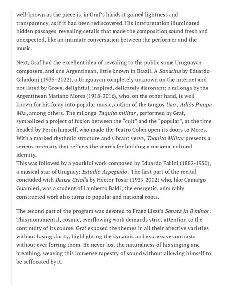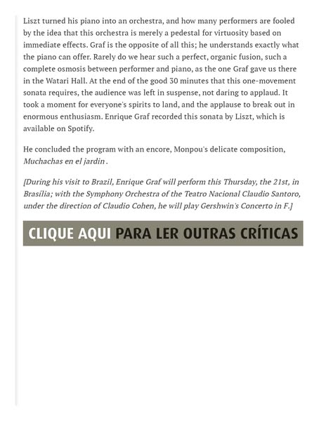 搜索关键词 music review, concert review, piano performance, classical music, Revista CONCERTO, enrique graf, musical artist, positive feedback, arts publication, online journal优势 Prestigious review publication,Positive and humbling tone,Provides a link to the full review