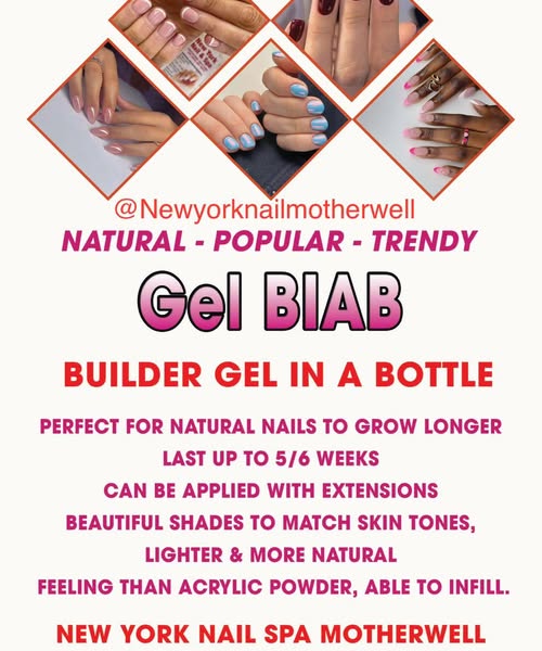 搜索关键词 nail salon, spa pedicure, acrylic extensions, gel biab, shellac colors, nail art designs, motherwell salon, nail care services, luxury spa, professional manicure优势 Wide range of nail services (Gel, BIAB, Acrylic),Luxury spa pedicure with massage,Convenient location with free parking,Walk-ins welcome,Professional care for ladies and gentlemen
