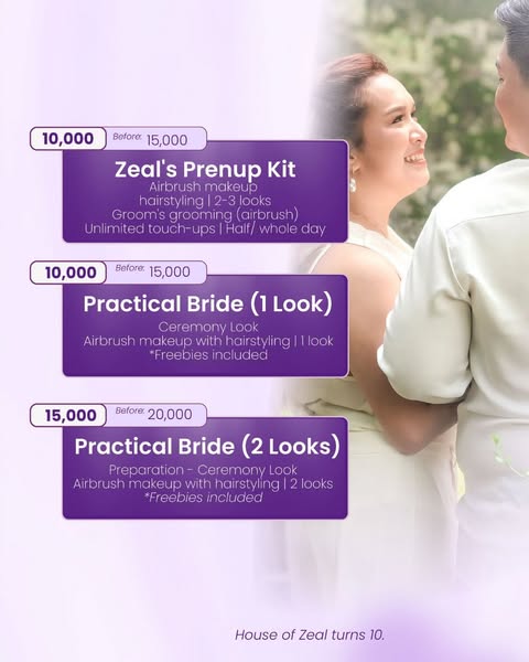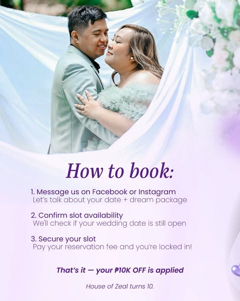 搜索关键词 wedding package, bridal promo, sweet cart giveaway, House of Zeal, anniversary celebration, limited slots, wedding reviews, event planning, wedding services, bridal services优势 Chance to win a free sweet cart,₱10,000 OFF promo,Real bride reviews available