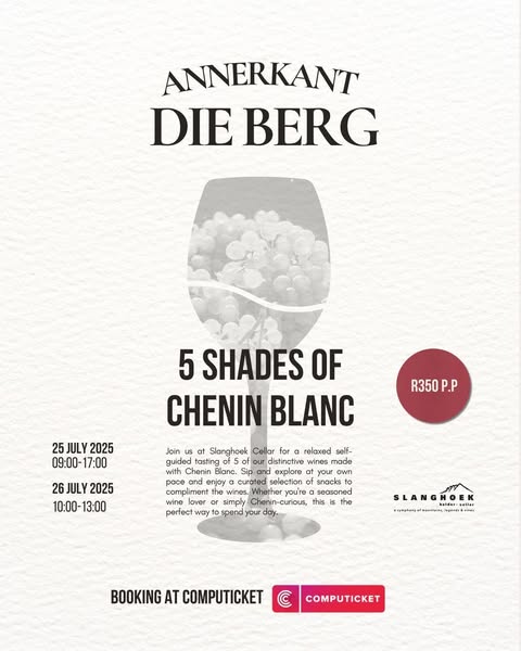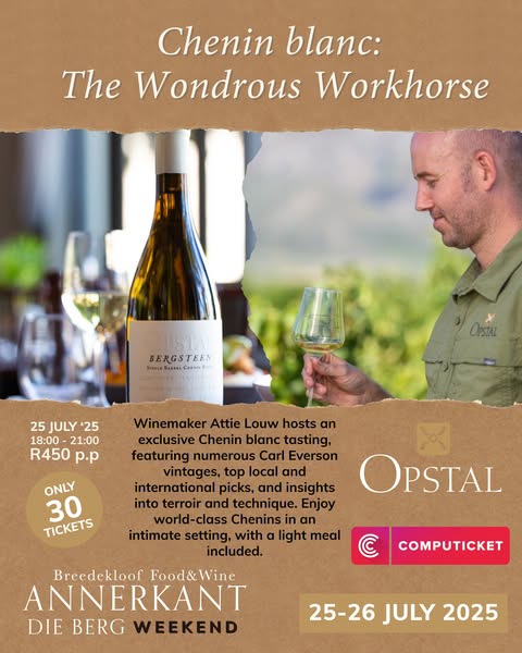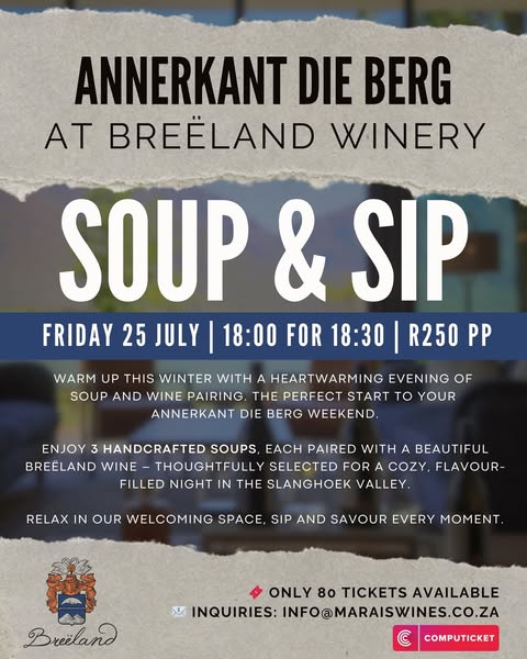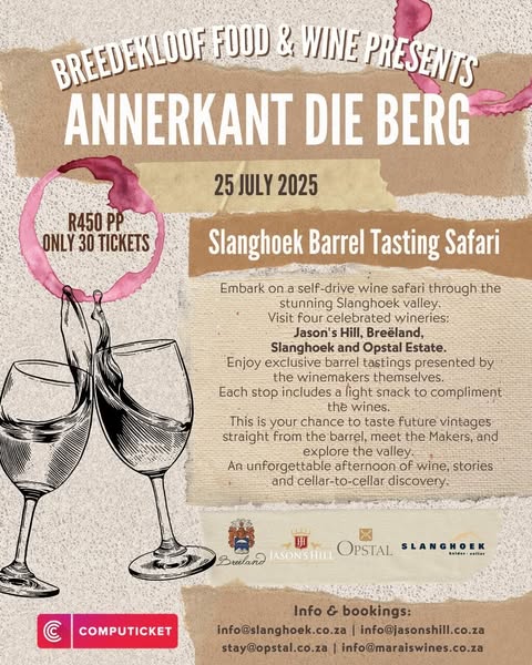 Join us for a winter celebration in the heart of the Breedekloof Wine Valley at Annerkant die Berg, taking place on Friday 25 and Saturday 26 July 2025. Set against the dramatic backdrop of the Slanghoek mountains, this intimate event invites you to explore the region’s warm hospitality and exceptional wines through curated experiences hosted by passionate local producers. From exclusive barrel tastings and soulful food pairings to guided tastings and storytelling evenings, each event offers something unique. With limited tickets available per experience, this is a rare opportunity to discover the valley’s hidden gems — on the other side of the mountain.
