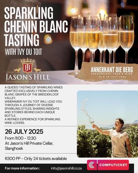 搜索关键词 Breedekloof wine valley, South Africa wine, wine tasting, Annerkant die Berg, wine festival, Jason's Hill, Marais Family Wines, Slanghoek Wine Cellar, Opstal Estate, Chenin Blanc tasting优势 Unique wine tasting experiences,Curated events by local producers,Intimate and exclusive atmosphere,Beautiful location in the Breedekloof Wine Valley,Opportunity to discover hidden gems