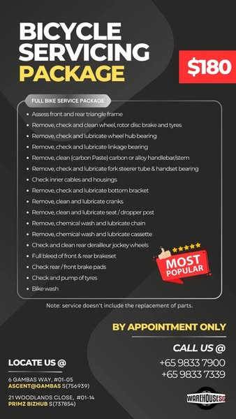 搜索关键词 bicycle servicing singapore, bike repair service, singapore bike service, bike maintenance package, bike service appointment, woodlands bike service, canberra bike service, ebike service singapore, bike servicing promotion, bike tuning singapore优势 Comprehensive service packages,Two convenient locations,Clear pricing
