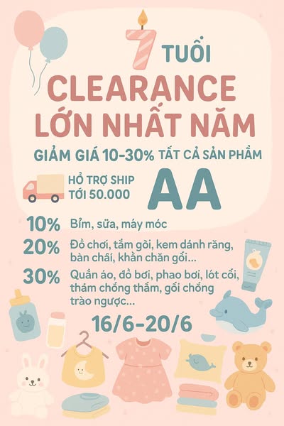 搜索关键词 baby products sale, kids clothing discount, diapers and milk offers, toys promotion, baby care items, AA anniversary, online baby store, discounted baby gear, swim wear deals, baby essentials sale优势 Up to 30% discount,Shipping fee support up to 50,000 VND,Wide range of products on sale