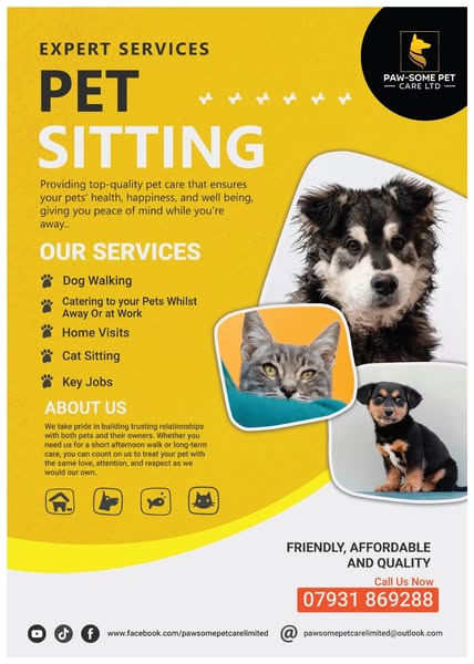 📞 Contact us today on 07931869288 or message us on Facebook @ Paw-Some Pet Care LTD to learn more about our services or to book an appointment. Let's keep your pets paw-sitively happy and healthy together!