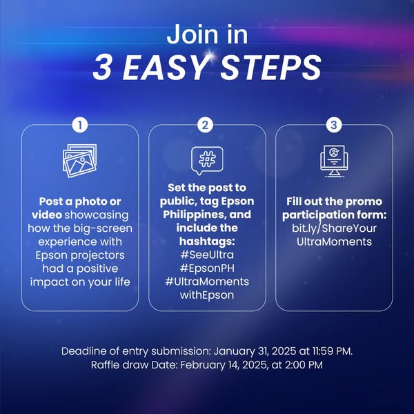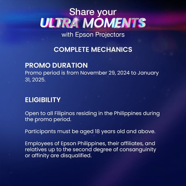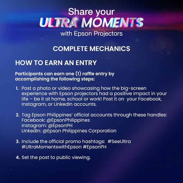 搜索关键词 Epson Projector promotion, UltraMomentswithEpson, Epson Philippines, Projector raffle, Big screen experience, Share your moments, Win prizes, Epson projector users, Raffle draw, Epson social media优势 Chance to win prizes,Easy participation steps,Promotes user engagement
