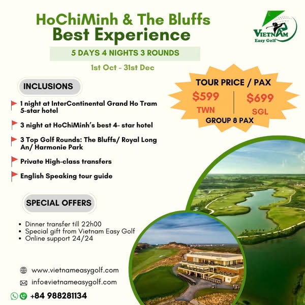 • Day 2: Golf at 𝑻𝒉𝒆 𝑩𝒍𝒖𝒇𝒇𝒔 𝑮𝒐𝒍𝒇 𝑪𝒐𝒖𝒓𝒔𝒆, a coastal gem with stunning views. Return to Ho Chi Minh City.