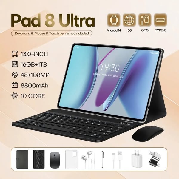 - Tablet PC: Ram16G+Rom1000G, internet4g, 6000mah , កាន់ថ្មបានយូរ និងCamara HD ច្បាស់(5MP+13MP), អេក្រុង 10.5inh, 13inh, 14inh, Work time: 8hours