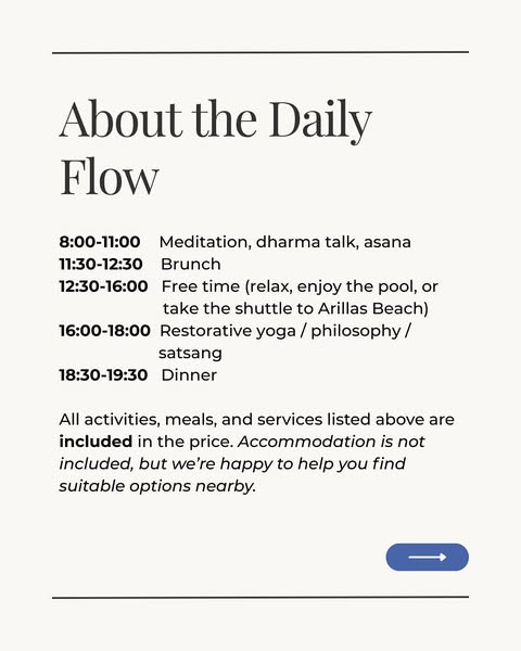 All activities, meals, and services listed above are included in the price. Accommodation is not included, but we’re happy to help you find suitable options nearby.