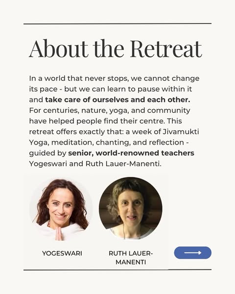 In a world that never stops, we cannot change its pace - but we can learn to pause within it and take care of ourself and each other. For centuries, nature, yoga, and community have helped people find their centre. This retreat offers exactly that: a week of Jivamukti Yoga, meditation, chanting, and reflection - guided by senior, world-renowned teachers Yogeswari and Ruth Lauer-Manenti.
