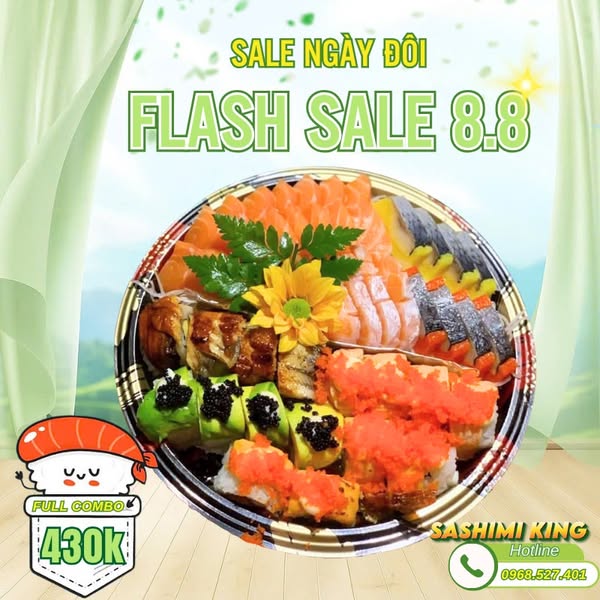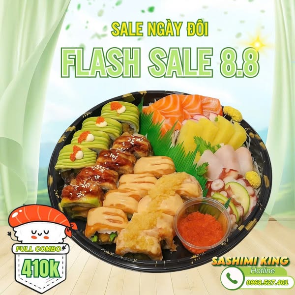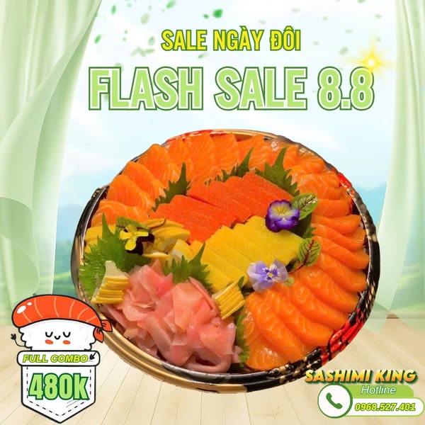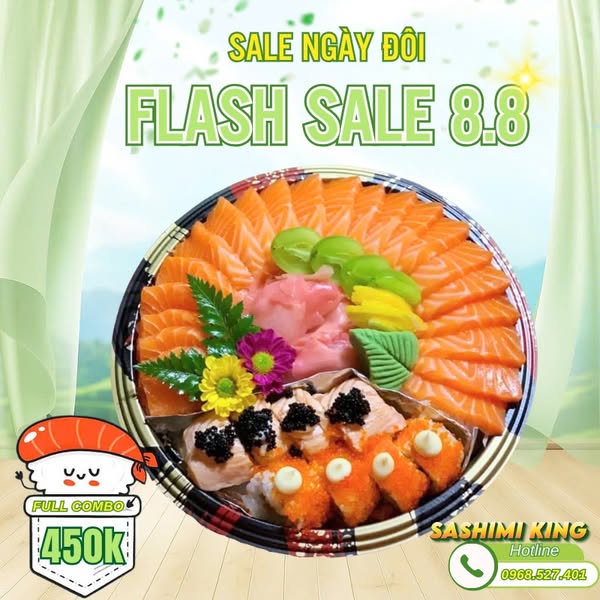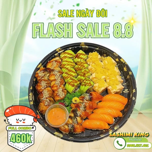 搜索关键词 sushi sale, 8.8 promotion, sashimi delivery, japanese food, fresh sushi, sushi king, vietnam food delivery, discounted sushi, limited time offer, best sushi deal优势 Fresh Sashimi,Generous Toppings,Authentic Japanese Flavors,Limited-Time Discount
