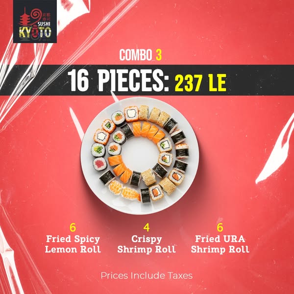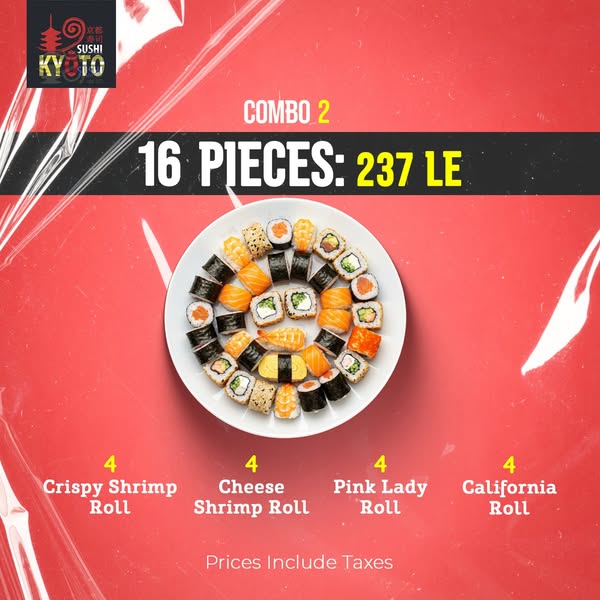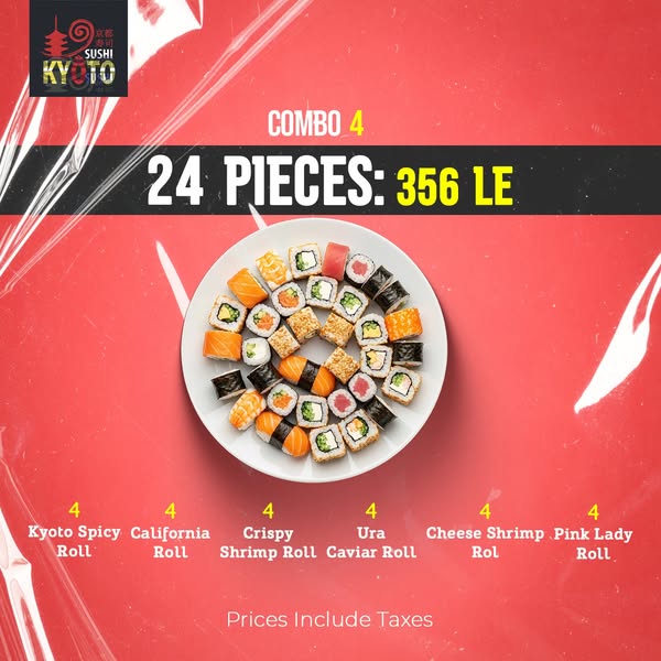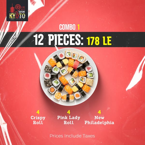 搜索关键词 sushi discount, kyoto restaurant, combo meals, sushi delivery, egypt food优势 30% discount,Multiple location options,Combo meal variety,Prices include taxes