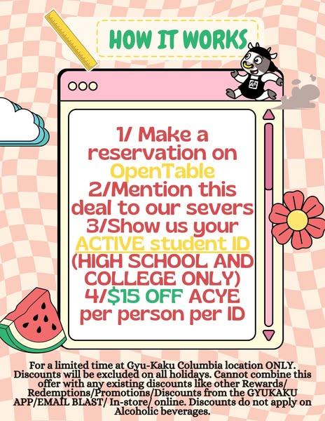 搜索关键词 student discount yakiniku, all you can eat, happy hour columbia md, gyu-kaku columbia, tuesday yakiniku, premium all you can eat, japanese bbq restaurant, gyu-kaku student deal, yakiniku near me, gyu-kaku happy hour优势 Student Discount,AYCE (All You Can Eat) Available,Happy Hour Deals