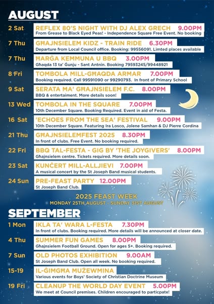 The calendar of the Għajnsielem summer events for 2025 is out! 👊 Another packed calendar full of cultural and educational events for all ages! Each event will be advertised individually.