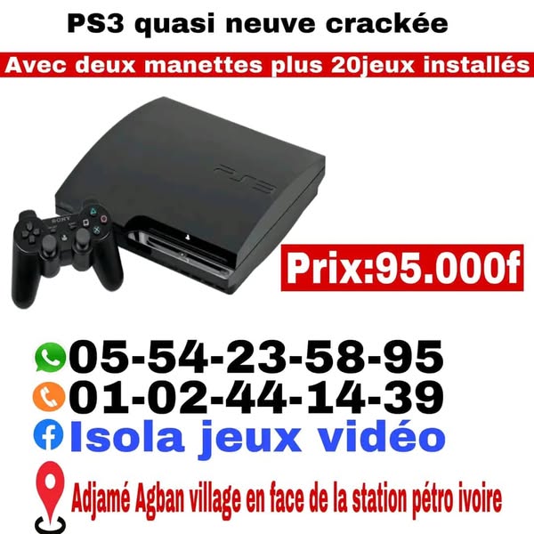 搜索关键词 video game consoles, PS3 cracking, PS4 game install, Adjamé Agban, ISOLA JEUX, PlayStation promotion, affordable consoles, video game warranty, console repair, Ivory Coast video games优势 Affordable prices on video game consoles,Warranty on purchased consoles,Cracking and game installation services (PS3, PS4)