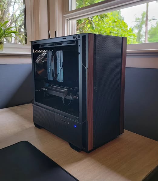 This custom setup features the sleek Okinos Cypress 3 Micro-ATX case—modern airflow meets timeless woodgrain style in a compact footprint.