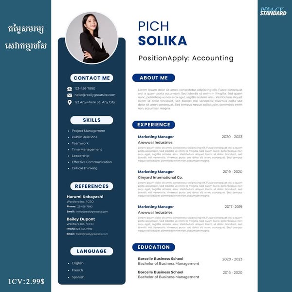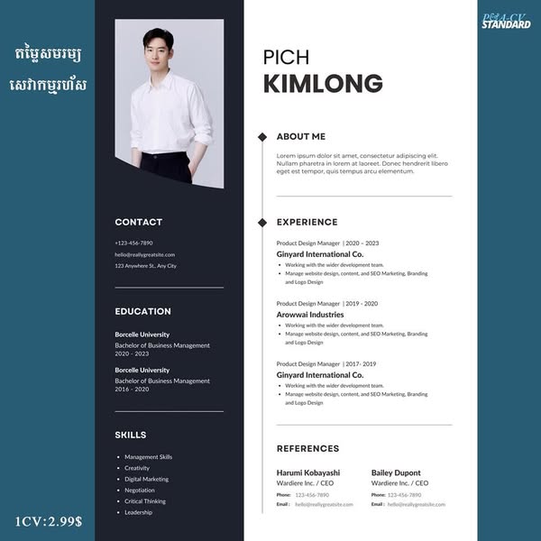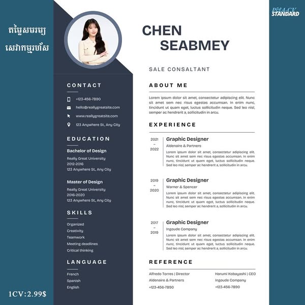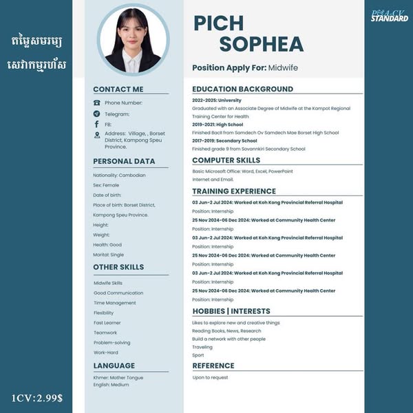 ប្អូនៗសិស្សនិស្សិតយកធ្វើជាគំរូបាន។ជាពិសេសបងប្អូនដែលកំពុងស្វែងកាងារលើកដំបូងដែលមិនទាន់មានបទពិសោធន៍ក្នុងការរៀបចំ CV បងប្អូនអាចទាក់ទងមកខាងយើងខ្ញុំបាន។ ពួកយើងមានទទួលប្រឹក្សាយោបល់និងរៀបចំ CV និង Cover letter ដែលត្រូវតាមស្តង់ដាបច្ចនប្បន្ន