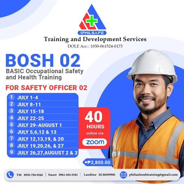 搜索关键词 COSH BOSH training, safety officer training, occupational safety, health workplace, DOLE accredited, safety officer id, safety training certificate, safety courses, engineer architecture, face to face training优势 Nationwide Delivery,CPD Units,Multi-skilled OSH Consultants,DOLE Accredited