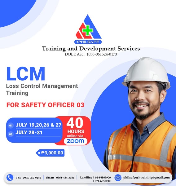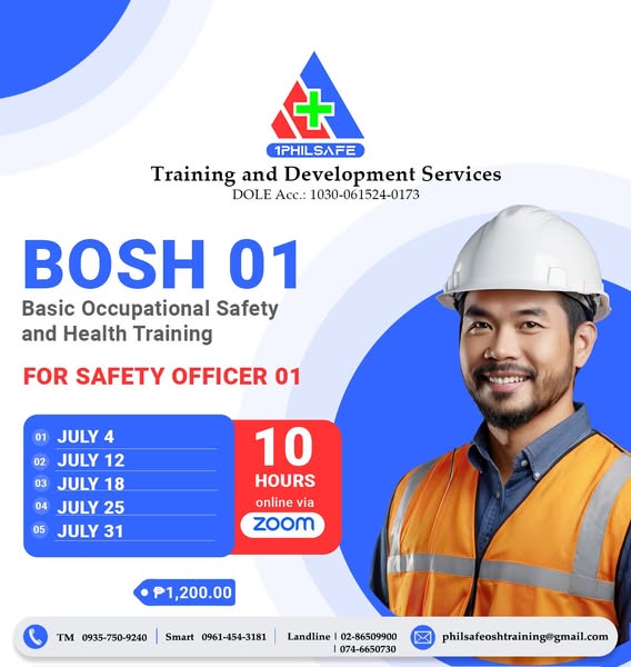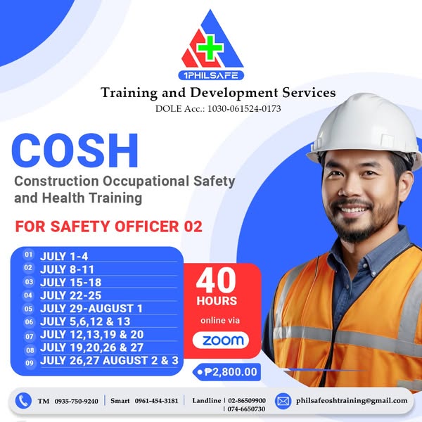搜索关键词 COSH BOSH training, safety officer course, occupational safety training, OSH certification philippines, workplace safety training, DOLE accredited training, safety officer seminar, safety and health training, engineer architecture safety training, LCM SPA HIRAC training优势 Certificate of Completion,Training Manual,Safety Officer ID,OSH Standards E-book,Free delivery Nationwide,CPD Units,Trained with multi-skilled OSH Consultants