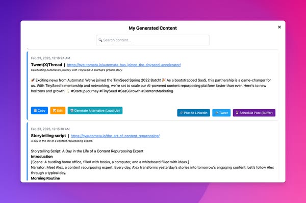 💡 Instantly generate social media content from any link. Edit, post directly, or create alternative versions in one click. AI-powered content repurposing made simple—try it now! 🚀
