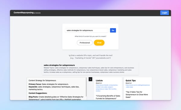 搜索关键词 AI content generation, social media management, content repurposing, social media marketing, automated content, instant posting, content creation tool, social media growth, AI powered tools, social media automation优势 Instant content generation,Easy editing and posting,AI-powered content repurposing