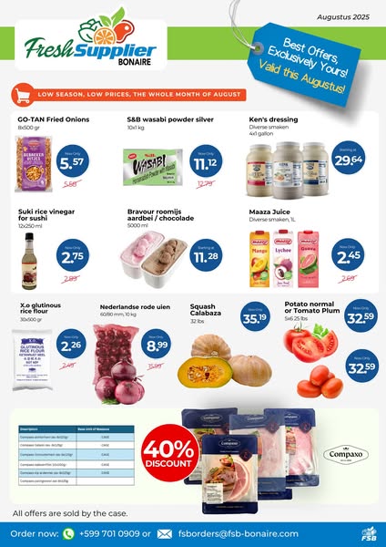 搜索关键词 Fresh Supplier Bonaire, Bonaire Business, Horeca Deals, Retail Wholesale, Case Offers, August Deals, Grocery Supplies, Bulk Food, Food and Beverage, Supermarket Supplies优势 Unbeatable prices,Bulk buys available,Convenient ordering options (online, WhatsApp, in-person)