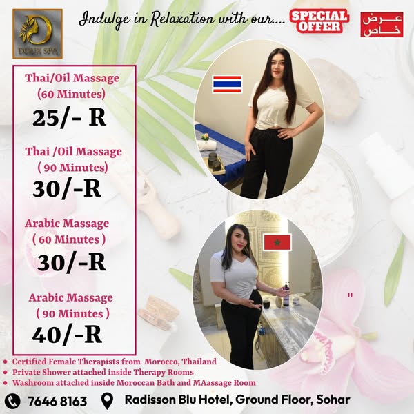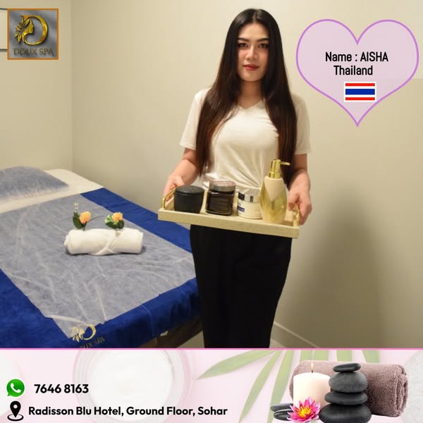 搜索关键词 luxury spa, Muscat spa, Oman massage, Thai massage, Radisson Blu Sohar, spa day, women massage, wellness retreat, grand opening, relaxation rejuvenation优势 Luxurious experience,Tranquil environment,International therapists,Convenient location,Opening day offers