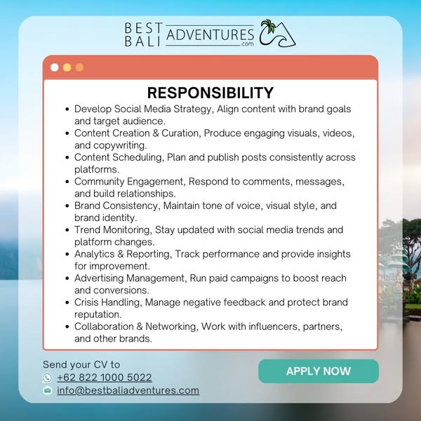 搜索关键词 social media specialist, sanur job, marketing job, advertising career, office team, social media career, specialist jobs, office team jobs, team member jobs, bali marketing优势 Opportunity to work in Sanur,Join a team