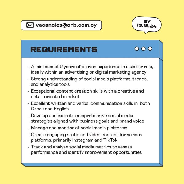 Στείλε μας το βιογραφικό σου στο: vacancies@orb.com.cy μέχρι 13/12/2024.