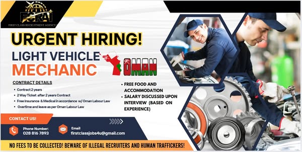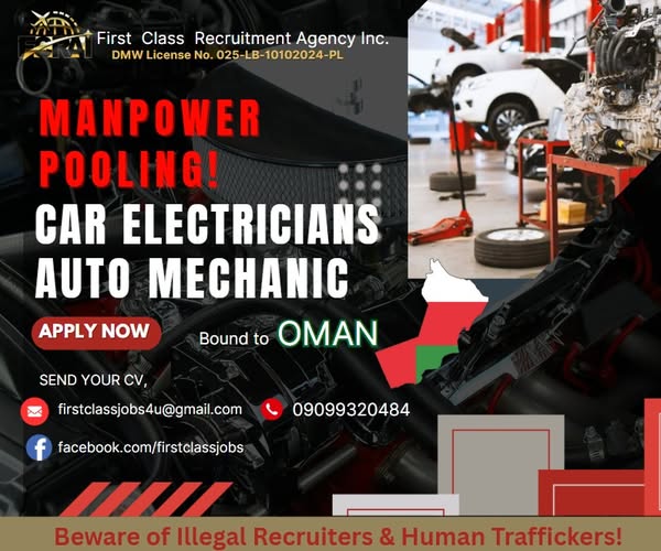 #WorkAbroad #OmanJobs #OFWHiring #MechanicJobs #FloristJobs #CarElectrician #HiringNow #FirstClassJobs