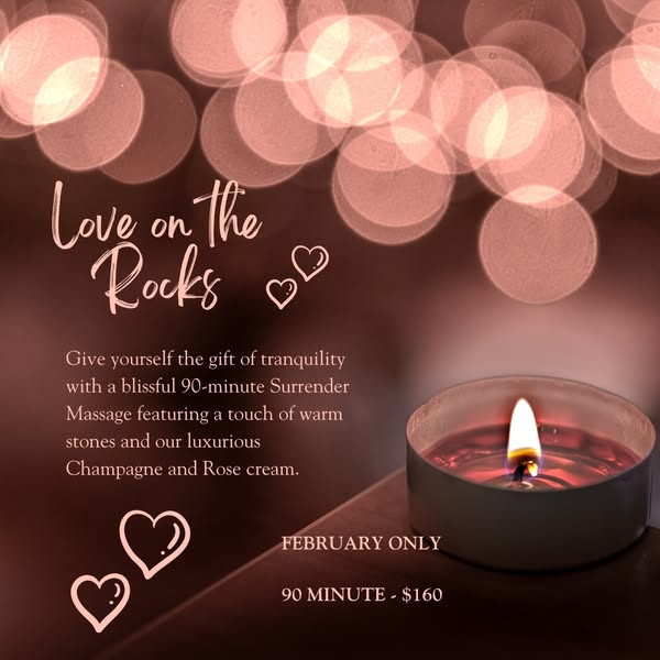 For the month of February, we have three special services that say “I Love You”. Our “Sweetheart Duet” is an indulgent 60 or 90 minute Couples Massage that includes a touch of warm stones, a luxurious Rose and Champagne cream, and ends with a gift from us: a rose and fine chocolates.