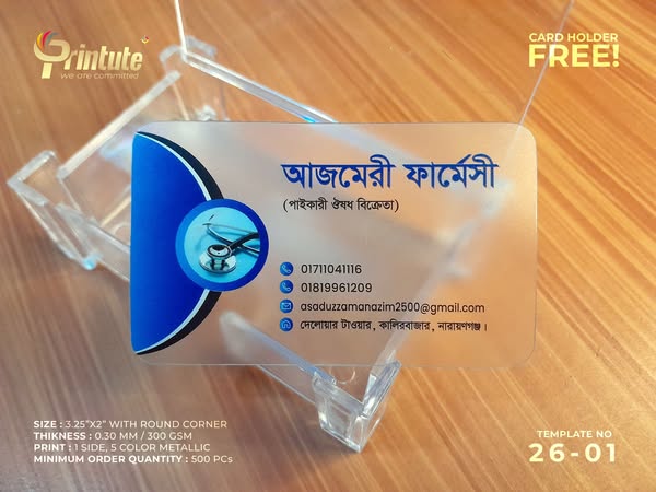 আমাদের ট্রান্সপারেন্ট বিজনেস কার্ডের 🖨 প্রিন্ট কোয়ালিটি এবং ফিনিশিং 👌 আপনাকে মুগ্ধ করবে। প্রতিটি কার্ডে পাবেন নিখুঁত স্বচ্ছতা এবং প্রিমিয়াম 🎩 টাচ, যা আপনার ব্র্যান্ডের ইমেজকে 💹 আরও উচ্চতায় নিয়ে যাবে। পানিতে ভিজলেও 💦 নষ্ট হবে না, আর নখ দিয়ে ঘষলেও রং 💥 উঠবে না। টেকসই ও স্টাইলিশ ডিজাইন – একবার ব্যবহার করলেই পার্থক্য বুঝতে পারবেন 😎
