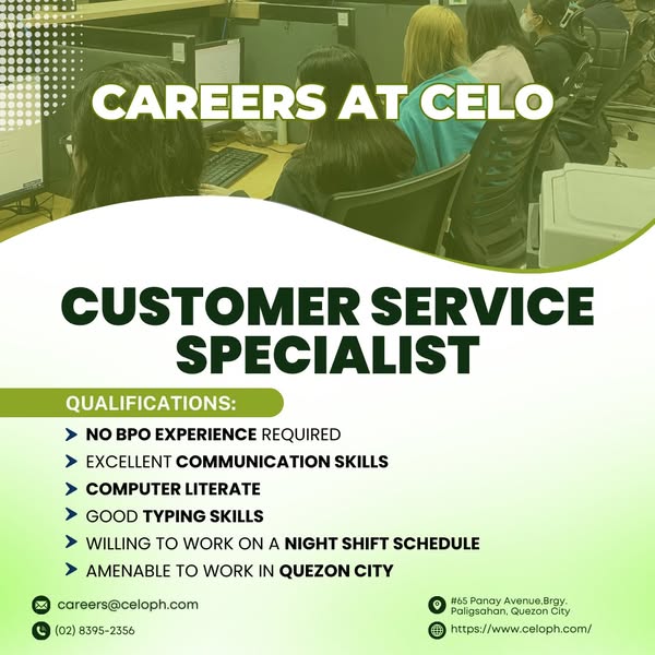 搜索关键词 customer service specialist, job opportunity, BPO career, Celo Business Solutions, newbie friendly, paid training, Quezon City jobs, outsourcing services, call center jobs, rewarding career优势 Newbie-friendly,Night differentials,HMO,Paid training,Long-term Opportunity