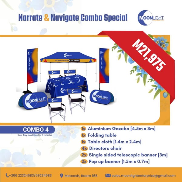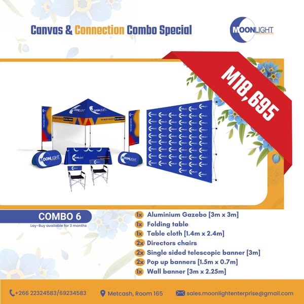 #MoonlightEnterprise #PromoCombos #BrandedGazebos #FlagBanners #MarketingSolutions #IndoorOutdoorBranding #BusinessBoost #MaseruDeals #LesothoBusiness