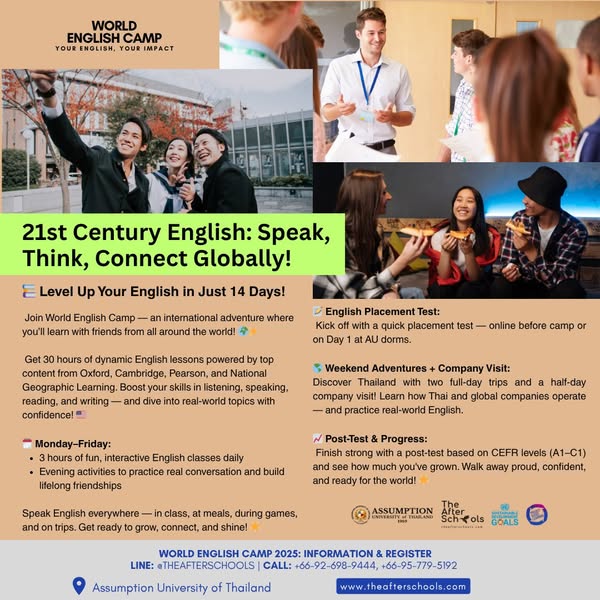 搜索关键词 World English Camp, Youth Camp, International Camp, English Language, Summer Camp, Bangkok Pattaya, Assumption University, Gen Z workshops, TheAfterSchools, English Camp Discount优势 Improve English confidence,Make international friends,Various activities and excursions,Accredited certification,Early bird discount
