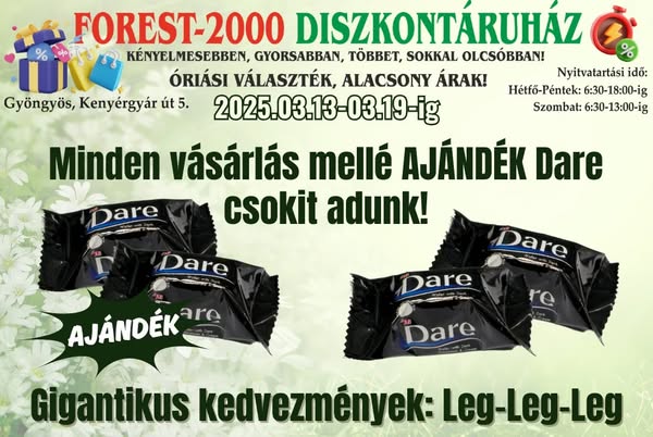 A 2025.03.13-19-ig tartó időszakban 🍫 CSOKOLÁDÉ VÁSÁR-ral is várjuk kedves Vásárlóinkat és ha már csoki, továbbra is MINDEN VÁSÁRLÁS MELLÉ AJÁNDÉK DARE CSOKIT ADUNK! 🍫