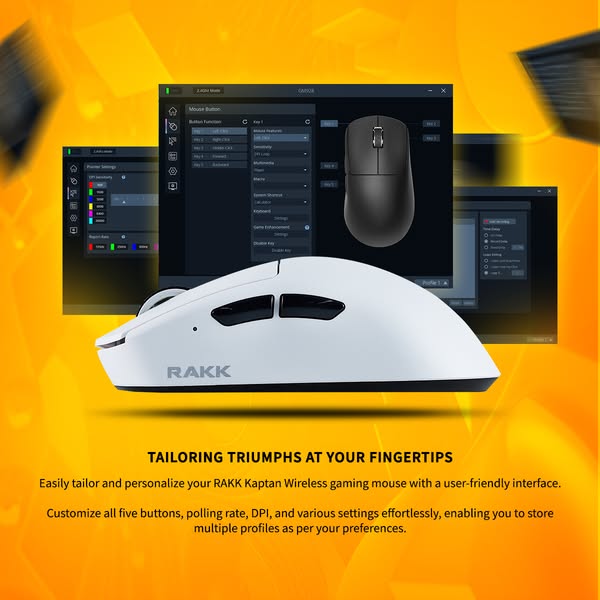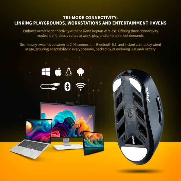 搜索关键词 RAKK Kaptan Wireless, Gaming Mouse, Wireless Mouse, Pixart 3395, Lightweight Mouse, Tri-Mode Connectivity, Huano Switches, Gaming Peripherals, PC Gaming, Esports Mouse优势 Pinpoint Accuracy (Pixart 3395 Sensor),Lightweight (53g),Wireless Tri-Mode Connectivity,Durable Switches (Huano Blue Shell Pink Dot 80M),Ergonomic Design
