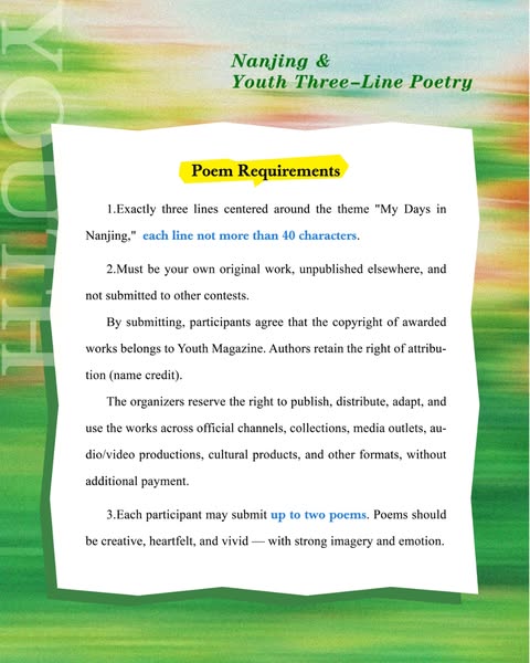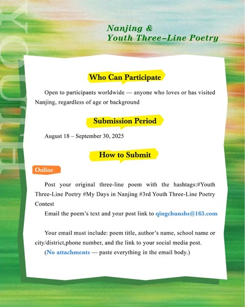 搜索关键词 Nanjing poetry contest, three line poem, cultural event, discover Nanjing, inclusive city, youth contest, short poem contest, Nanjing vibes, city poem, poetry competition优势 Inclusive and open to all,Promotes creativity,Celebrates Nanjing