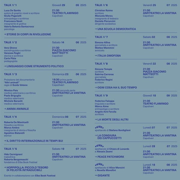 搜索关键词 literary festival, cultural events, Elba Island, book discussions, author talks, summer program, island events, community engagement, free events, family activities优势 Diverse range of topics discussed,Presence of notable authors and experts,Events for both adults and children (#KIDS),Free event series,Held in scenic locations (Capoliveri, Elba Island)