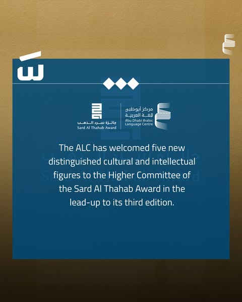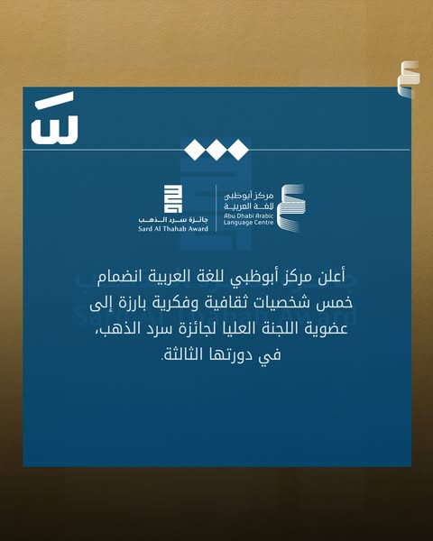#مركز_أبوظبي_للغة_العربية يعلن انضمام خمس شخصيات ثقافية وفكرية بارزة إلى عضوية اللجنة العليا لـ #جائزة_سرد_الذهب في دورتها الثالثة، كما تستقبل الجائزة طلبات الترشح لدورتها الثالثة حتى 31 مايو 2025.