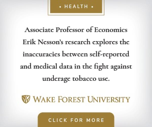 What we say isn’t always what we do. In the fight against nicotine addiction, Wake Forest economist Erik Nesson has teamed with researchers from other universities to combine medical testing with self-reported data to paint a far more accurate picture of underage tobacco use. Among other findings, their results have shown discrepancies between the self-reported data and urine testing that suggests more aggressive tobacco age restrictions may not be as effective as originally thought.