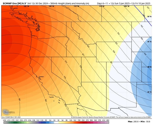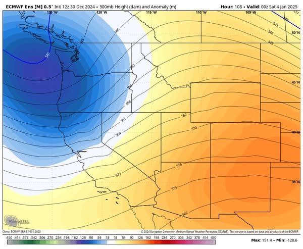The weather pattern in the short-term for New Year's Eve and New Year's Day looks pretty tranquil, although Tuesday and Wednesday will have temperatures in the low 50s as cold air advection continues at the 850mb level, this combined with low 30s for Tuesday morning and a low Sun angle will make temperatures to struggle to get into the 50s for these two days so if headed out early in the morning both for Tuesday morning and Wednesday morning expect To wear a heavy coat and perhaps some mittens as again overnight lows will dip into the lower 30s with some of the coldest locations possibly getting down to as low as 28 or 29°. But because of low confidence in the forecast Frost advisories and freeze warnings are not currently anticipated at this time, although we may also have to watch for the possibility of dense Valley fog formation south of the San Joaquin Valley tonight but if any forms it will likely be patchy and rather shallow and will burn off pretty quickly tomorrow (around 8 am). Now as we go into Wednesday morning dense valley fog could be more of an issue as it becomes more widespread since low level wind fields will switch more out of the zonal wind direction and not much of a north wind component. This will also aid in higher PWAT’s values too witch typically increase the overall moisture boundary layer. This is why Wednesday could be the coldest daytime high of the week since more extensive fog this time of the year with a fairly shallow Sun angle does not allow the fog to burn off as it did in mid-December, where we had a total of six fog days in a row. So expect a partly to mostly cloudy New Year's Day with cool temperatures.