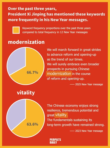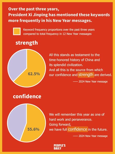 Analyzing the New Year messages since the 20th National Congress of the Communist Party of China in 2022 reveals that over the past three years, President Xi has particularly emphasized keywords such as "young people," "#revitalization," "#modernization," "vitality," "strength," and "confidence."