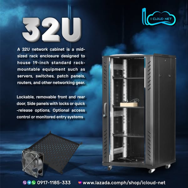 A 32U network cabinet is a mid-sized rack enclosure designed to house 19-inch standard rack-mountable equipment such as servers, switches, patch panels, routers, and other networking gear.