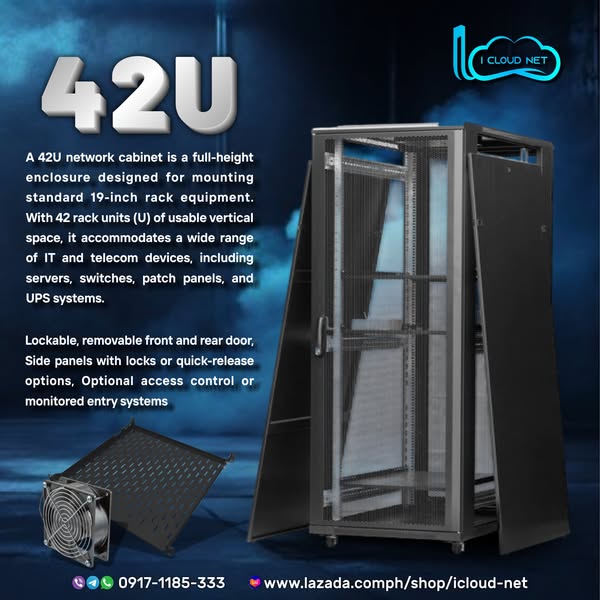 A 42U network cabinet is a full-height enclosure designed for mounting standard 19-inch rack equipment. With 42 rack units (U) of usable vertical space, it accommodates a wide range of IT and telecom devices, including servers, switches, patch panels, and UPS systems.