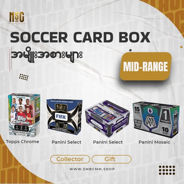 နောက်တစ်ဆင့်အနေနဲ့ ကိုယ်က Mid-range Box တွေကိုစတင်ဝယ်ယူချင်တယ်ဆိုရင် Topps Chrome, Panini Select, Panini Prizm, Mosaic စတဲ့ Box တွေကိုဝယ်ယူသင့်ပြီး Collector တွေတော်တော်များများလည်း ဝယ်ယူကြပါတယ်။နောက်ဆုံးအနေနဲ့ High-end Box အမျိုးစားတ္ဖေဖြစ်တဲ့ Panini Immaculate, Panini Impeccable, Topps Dynasty စတဲ့ Box တွေမှာဆိုရင် rookie card တွေ patch card တွေနဲ့ အခြားသော limited card တွေပါနိုင်တာမို့ ဈေးနှုန်းလည်း မြင့်မားပါတယ်။ တချို့သော collector တွေကတော့ ကိုယ်အားပေးတဲ့ အသင်းရဲ့ Team လိုက်ဖြစ်ဖြစ်၊ ကစားသမားဖြစ်ဖြစ် collect ချင်တာမျိုးဆိုရင် Team Set, Fan set စတဲ့ Box အမျိုးအစားတွေကို ရွေးချယ်ဝယ်ယူသင့်ပါတယ်။ကိုယ်က ဘယ် Box ကိုပဲဝယ်ဝယ် ယုံကြည်စိတ်ချရပြီး အာမခံချက်အပြည့်ဝပေးနိုင်တဲ့ ဆိုင်တွေကပဲဝယ်ဖို့အကြံပေးလိုက်ပါတယ် ခင်ဗျာ။
